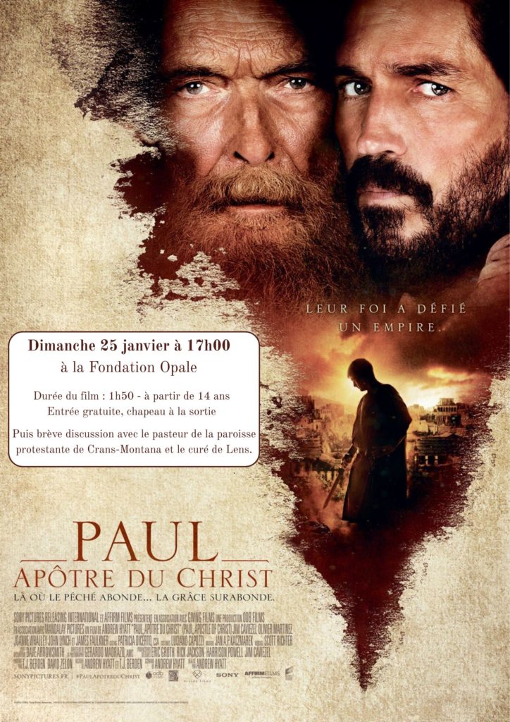 Dimanche 25 janvier à 17h, le film « Paul, apôtre du Christ » de Andrew Hyatt sera projeté à la Fondation Opale à Lens. Suite au film, un échange sera proposé avec le pasteur de la paroisse protestante de Crans-Montana et le curé de Lens.