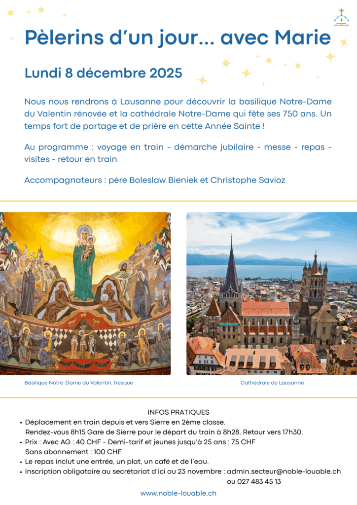 Inscription demandée d’ici au 23 novembre, auprès du secrétariat du secteur : admin.secteur@noble-louable.ch, ou 027 483 45 13.