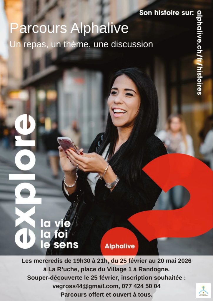 Le parcours Alpha vient à Randogne, après plusieurs éditions dans notre secteur pastoral. Un soir par semaine, dans un environnement bienveillant, une question fondamentale est abordée après un repas offert. Tout le monde est le bienvenu, peu importe ses croyances.